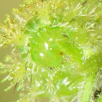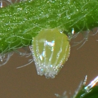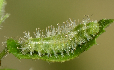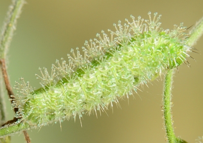 The younger caterpillars fed on tender leaves and possibly inflorescences, while older ones fed on mature leaves. The more mature larvae had a number of interesting features, most easily seen on the photo of the fourth instar. The scoli (branched spines along the body) were uniform except on the second segment (T2), where they were unbranched and much reduced. The bulbous ends secreted a sticky fluid that would gather frass or other debris. The head appeared to be covered with "bangs": thick setae curved over the face, the inner half white and the outer half black. The legs also had white setae; these were similar in color and size to the hairs on the edges of the Noseburn leaves.