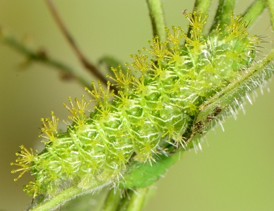 Another curious feature of these caterpillars is that the scoli were white at the beginning of an instar, but gradually darkened to gold and occasionally brown as the stage progressed. The same caterpillar is featured in both of the fifth instar photos to show this change.
